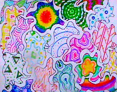 "I used to doodle within rambled shapes and then do patterns in pen. When this started, I had just gotten a gift of colored markers, so I committed to start there. My squiggle created the frame for the colors and patterns. I found myself drawn to a rainbow of colors, playing with patterns, combinations. As the time went on, some patterns repeated or developed.